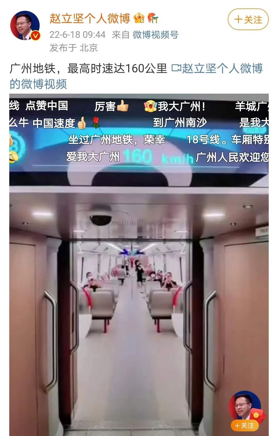 外交部發(fā)言人趙立堅@趙立堅個人微博近日發(fā)布一段地鐵列車視頻,并配文“廣州地鐵,最高時速達160公里”。視頻播放量已超62萬次,廣大網(wǎng)友紛紛點贊“中國速度”,稱贊地鐵列車“高鐵品質(zhì)”。