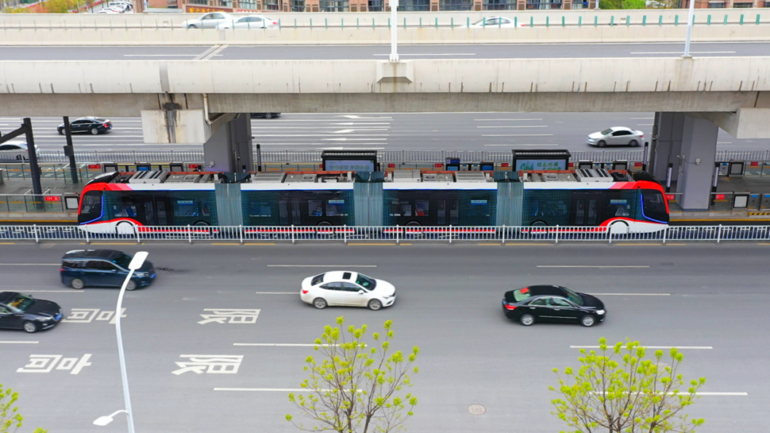 ? 新一代SRT列車全長32米,外形酷似地鐵,卻無需實(shí)體軌道,可按地面道路施劃的虛擬軌道線行駛,被形象地稱為“馬路上的地鐵”。列車采用低碳儲能管理技術(shù),充電5分鐘可行駛25公里,能夠根據(jù)運(yùn)營需求靈活編組,載客量超300人。